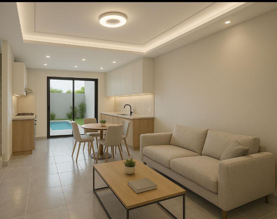 Sala y comedor integrados con vista directa a la terraza y piscina.